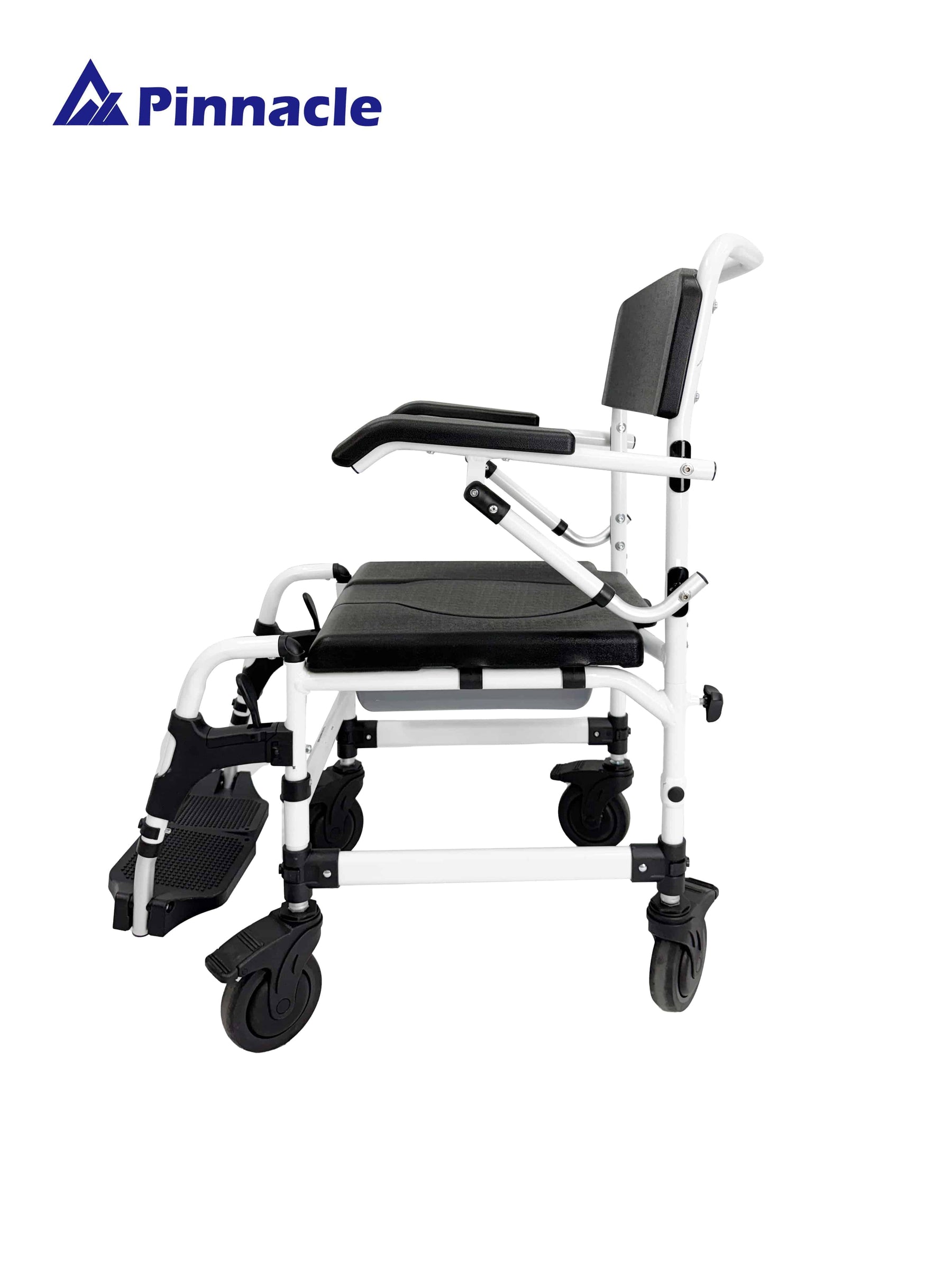 The Pinnacle Deluxe Shower Commode Attendant Propelled offers comfort and convenience with flip-up armrests for easy transfers. Tool-free height and leg rest adjustments provide customizable comfort, while its compact design makes it ideal for tight spaces and daily hygiene.